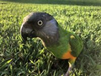 Dark green Senegal Parrot with orange/ yellow belly and grey head. Not used to being outside so he’ll probably be scared. Missing a few feathers over left eye with pin feathers coming in.