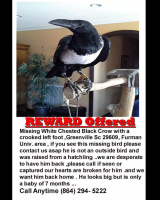 Black crow with white chest , still wearing leather ankle straps and 16 inch leads untied , one of his feet is crooked and he is very tame and dependant on people , we are offering a reward for his safe return