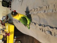 He says “ step up “ and pretty bird , he answers to the name Red and he loves to fly into your hair , he’s hand shy but we’ve been working with him he loves to swing and steps up on coat hangers covered in yarn and is missed dearly. He’s bird aggressive and cage aggressive but a sweet boy to people . He is very much missed and loved reward will be given upon his safe return. His fav noise is a loud GAH BEEP !!! He makes a low beep beep beep if he’s scared.