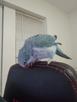 My bird is named Blue. Its a blue quaker and its approximately about 2-3 years old. He likes to sit on people’s shoulders and neck. Sometimes will nibble on you to try to ask for something. He is very wary and may be aggressive because he’s scared or doesn’t know better.