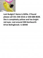 Red eyes. Completely yellow. Wings are not clipped. If found please email at reneegumm@gmail.com