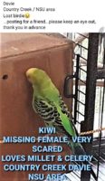 Curious & fun, I’m 1 year,2 months old & its around my birthday month. Shh. I’m a pretty girl, slim and small compared to some others, I’m an Australian Budgie/Parakeet. My colors are yellow and green with black stripes on my wings with markings on my jaw area that are a dark purplish black,I have a little white below my under belly. I usually like seed & millet but if you find me I might not of eaten in a while & would like soft food or wet crackers or soothing mushy.