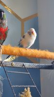 Male bird. Friendly, will hop on hand. Has blue patches on belly. Back has black patches