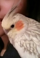 Female cockatiel, her color is pale yellow and gray with orange cheeks, her left wing is not even with her right wing, she loves to get petted on her head, she likes to nibble on paper, plastic, cloth, necklace, earrings, and plants