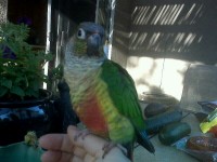 Pippin is a Yellow Sided Conure with a base color of green, a White neck, blue tail feathers, orange tummy surrounded with yellow. He has been missing since July 8, 2012. He is about 1 ½ times the size of a parakeet. He can say “uhuh” in a scratchy voice and “pippin” in a very loud screech and raspberries and toasted walnuts are his favorite things to eat. He loves to bathe under the faucet and he sleeps in a cuddle tent at night. He would dance if his “aunt” would sing to him, but not just by listening to music. He is a very cuddly boy (at least we think he is a boy), unless he is feeling crotchety and he will steal your heart away. There is a REWARD for his safe return…no questions asked. We have had him for over 2 years and now he’s lost, and no doubt missing all the coddling he gets at home…won’t someone PLEASE have a HEART and send him home to us??!! Please call (916) 214-5793 or (415) 845-1126.