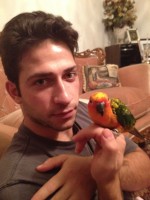 Shabaan is a 1 year old sun conure. He flew away this morning. He’s about 8 inches tall. He’s red/orange around the eyes and is yellow/orange on his body. His wings are green with a bit of blue on the tips. He is banded with a metal tag on one of his legs.