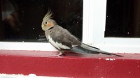 2 yr old female, gray, pied cockatiel with orange cheek patches and white trim on wings. Looks like normal gray, but has faint pearling on back, and small patches of yellow feathers on head and face. She is split-pied; owner will identify “unique” distinguishing features.