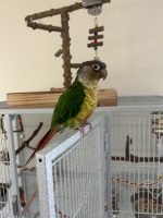 Coconut is a green cheek conure. She has bright yellow on her chest and underwings, blue tipped wings and a red tail. She also has a bright red patch on her tummy that makes her look like Captain Underpants. She was last seen being chased by a large bird and is probably terrified. While usually friendly she may bite if approached. If seen please contact!