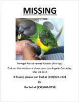 Alistair is a 1 year old Senegal parrot. He is bright green in coloring with a yellow belly, a grey head and yellow-grey eyes.He is small, no taller than 8 inches.