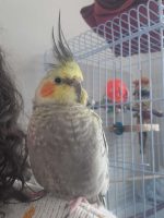 He is a young pearly cockatiel: pearled back, gray chest, yellow head with orange cheeks, a bright yellow tail. He has a bit of separation anxiety and might come down if he sees someone. His innermost front toenail on his left foot is pale as opposed to the rest of them, which are dark. This can be used to identify him. He is normally very quiet unless he has no one in line of sight in which case he begins to screech a singular piercing note over and over again.