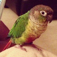 She is a green Cheek Conure almost an year old. Very loving and loves to stay on my shoulder.