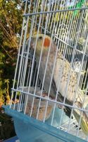 She is a yellow bird with white and grey spotted feathers. Her wings have white tips around the edges and her tail is yellow with black tips. Her belly is light grey with white spots.