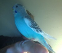 square white spot on top of head. deep blue spots to either side of beak, 5-7 months old. male.