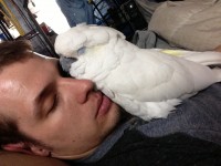 Bella /was/ fully flighted last time I saw her (the last week of August), which was at my home in Oakland. She doesn’t not have any unusual markings, possibly a very small stain on her back but I believe it’s gone now) She says (although difficult to make out) “I love you” “I love you too” “I really love you” “what??” “Okay!” “Hiiii” she is very expressive, even for a cockatoo. When you’re having a conversation with her and she want your full attention she’ll sometimes get a little sassy, hitting her beak on the ground or something, my impression is that it’s like she’s saying “hey! I’m talking – and I’m right about whatever in saying so there!” A total teenager… Not terribly rebellious, she loves to chew. But that has been channelled mostly in healthy ways.. She’s all in all quite well behaved, she used to go to the bathroom only on her cage, but when I moved I had to re-train her so if she’s in a new home with a new cage she probably doesn’t know better by herself. She often (if fed the “fruit blend” zupreem pellets) will omit one color every few days… She’ll eats all but yellow, three days later it’s everything but the orange, etc.. Just trying to think of any quirks since she looks pretty ordinary.. I am sure she would recognize me, she always has. Even after a couple weeks at the pet store over the holidays.