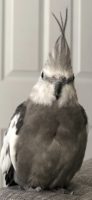 She’s grey and white. Her name is Luna, she’s very sweet, doesn’t bite. Although she might be scared. She likes to land on peoples heads. Her head feather are always up