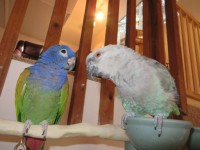 Maya is the bird on the right in the photo she is grey and green with a little peach flecks on her belly. She says hello Maya. She is very tame. She was stolen or went missing with two other birds. A blue head pionus, Roxie, and a Congo African Grey, Scarlett. We are offering a reward for their safe return. All birds are micro chipped. Bands could have been removed. Please contact us at 831-588-3148 or email Bonnie@playingwithfireandknives.com
