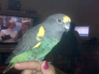 Midori is a Meyer’s parrot with a grey throat, back and head. She has a patch of yellow on her head near the top of her beak, and also at the tops of her wings. Her belly is green as well as her lower back above her tail feathers. When she extends her wings, you can see a mixture of green and blue on her back/lower back. She is an average sized Meyer’s about 21cm (8.2 inches) long and 3.5 – 4.7oz.