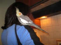 Grey and white cockatiel with yellow head and orange cheeks. Distinctive marking on the back of the head. Whistles