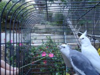 A very sweet white face lutino Cocatiel hes on the right (pure white). Around 6 months old and is very shy. It flew away on January 4 in Rancho Bernardo 4s Ranch.