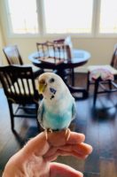 A blue and white parakeet named Tweety Pie flew out the open garage door on 10/5 around 3 pm. She has a distinct white streak on the back of her head, very timid and apprehensive of strangers.