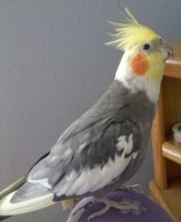 Common gray with bright orange cheeks, whistles cat calls and summoning whistle. Chirps loudly and bops when you whistle “Yo Ho A Pirates Life For Me”. Doesn’t like to be handled, but enjoys perching on shoulder or head. Likes junk food. Sweet bird but easily spooked.