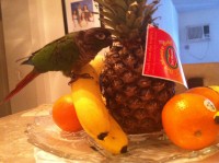 very friendly, loves to be around people, she’ll stand on your shoulder and likes to be petted and loves to say “daddy”