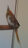 Faye is a female pearly Pied Cockatiel. She is young (2-3 years) and people friendly but with a slight fear of hands. She usually responds to flock calls and has a very distinctive cry when she wants attention.