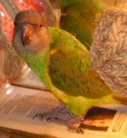I lost him in the morning. He loves Carrots, dorito chips, pizza crust, flour torillas, loves his peas. He will perch to you, he is domesticated. He is familiar with his neighborhood. He says his name Beebs,, , such as Beeeeeeebs… He understands the words, Stop it Beebs, peek a boo, he gets excited when I clap. He’s a good baby and I miss him. He’s all Green and oranage/yellow chest, gray head.