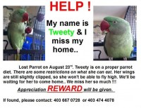 Lost Parrot on August 23rd. Tweety is on a proper parrot diet. There are some restrictions on what she can eat. Her wings are still slightly clipped, so she won’t be able to fly high. We’ll be waiting for her to come home.. We miss her so much !!!