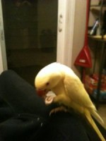 Our yellow Indian Ring Neck Parrot has gotten spooked away. She was on my boyfriends shoulder outside and she flew off! She was last seen on Mohawk Road West. If you find her please call us 403-328-3772