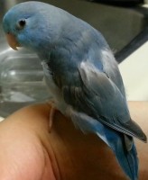 Wryn is a blue female parrotlet. She appears to be going through a stage of molting, so her feathers will look a little rough. She has some of the underfeathers exposed on her back as well as she is missing a patch of feathers on her left chest (feathers are growing in though).