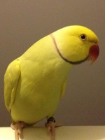 He’s primarily yellow. His ring is black around the front and red around the back, and his beak is bright red. He has a green identification band. He talks and whistles. He was confirmed to be last seen on June 7 in the evening flying through someone’s yard on Forbes and W. Keith Rd.