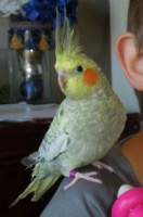 His name is Cinnamon and he is a green and gray 8 month old Pearl Cockatiel. He likes to whistle the tune you would if you saw a pretty lady walk by you and is his distinct trade mark. He has a purple band on his ankle as we bought him from a registered breeder out of town.