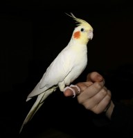 White (lutino) with yellow head feathers and orange cheeks, female, hand tame