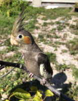 She is a 1 year old cockatiel. She is very friendly and loves to be around people. She is very tamed but however had flew out of the house one day. Her name is Sushi, she is a grey cockatiel. When her tail grew there were little heart shaped mutation of yellow on it when looked closely, may not always be exactly visible.