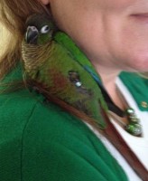 Has what looks like white string where the red tail feathers meet the body. Partial id tag AAC14P. Owner will provide rest of number.