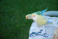 LOST IN JAMESWOOD AREA ON SATURDAY 15/6/12- Made a big mistake and one of my little lovebirds flew away. Her name is “Little Girl”, we have had her for 5 years and are heartbroken. Her mate is lost without her. Please call me if you see her. She is a beautiful pale yellow with a maivey blue tail. She is pictured here with her mate.