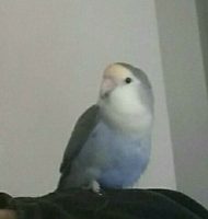 LOST: BLUE, PEACH-FACED lovebird aprox 3-4 yrs old although I don’t know very much about his history. He does not have a leg band. He escaped Wed. Feb 21, 2018 about 615 pm, on McQueen St., Shediac, NB, Canada. E4P 2H7. He loves people and is very social- will call out and bob his head….just doesn’t like hands. He loves to fly to your shoulder which is how he got out…my husband didnt know he was there. When we got him his name was Paca but whenever we would say hi to him we would say “your a pretty bird and he would get all excited and start chirping and bobbing his head up and down and he has consistanly responded to this, so this is what we call him. He has no scars or distinguising marks except the tip of his beak is blue-black and he has a few pins coming in that are quite pronounced around his neck on the right side almost to his shoulder. Note: he is not dna confirmed male- just deeper more vocal voice, bigger, faster more social with flattened head compared to my dna confirmed female, (all of which I know doesn’t mean male). Thank you in advance for your assistance. angela_ad@rogers.com