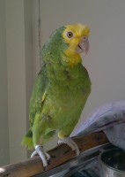 Chiquita was playing on top of her cage when something startled her. From a distance of about three feet she flew directly toward a safety screen on the living room window. She broke right through and since I am in a fifteenth floor apartment she was able to disappear very quickly.She is nervous of strangers but will talk easily once she is used to them. She speaks clearly and says things like ” there you go, what a beautiful bird, hello , night night, good morning, see you later ” . She also will make a full range of barnyard sounds. She has no physical flaws and the yellow head feathers are advancing quickly. She will say up up when presented a finger. If she is nervous she may not step up.