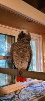 She can be skittish, has always been flighted so can fly very well. Loves seed mixes and will come to a shaking bag. Banded on her right leg. Chest feathers are freshly grown in.