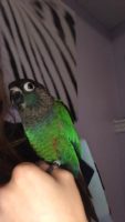 Eddie is a small conure with green body and black head. He is very friendly and will approach any calm person. He will get on your finger if offered. He doesn’t talk or squawk, but whistles and squeaks, very high pitched