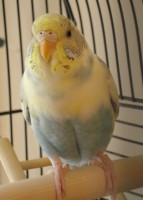 Lost budgie. Her wings are pale yellow and she has a blue belly. She is a “fancy” budgie so she does not have the same markings as regular ones…