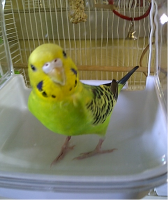 Tweety is a yellow and green budgie and she has a blue tail. She is friendly and likes to perch on hands.