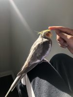 Make cockatiel almost 3 years old. Has pastel yellow head and orangey peach nose. Has a slight white outline between the grey head and yellow face.