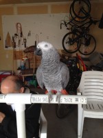 Black beak, red black tail, mostly grey feathers. He is a male. 1 year and two months old. He likes to whistle allot, he says koko I love you, hello, makes kissing sounds and some other sounds as well. His feathers were clipped, but he still managed to go pretty high and pretty far. He doesn’t bite, unless bugged too much. If you find him please please inform us! You don’t know how much love! We miss him already! Thank you very much!