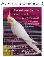 A lutino cockatiel has been reported lost in Old Longueuil QC, on De Maricourt street. His name is Charlie.