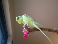 Yellow budgie with a bit of blue. very sociable. very loved.