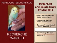 A budgie has been reported missing in Pointe-Claire QC, in Valois area.