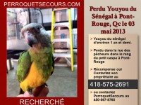 A Senegal parrot has been reported lost in Pont Rouge QC.