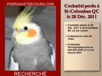 Since Josee contacted Perroquetsecours to handle her missing bird, contact us at 450-567-8765 or at avisderecherches-at-perroquetsecours.com and we will relay the information.
